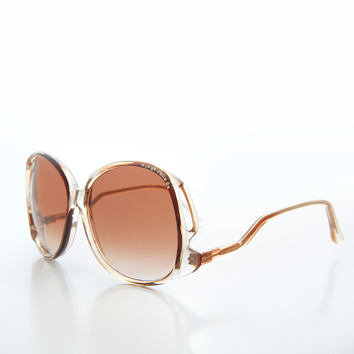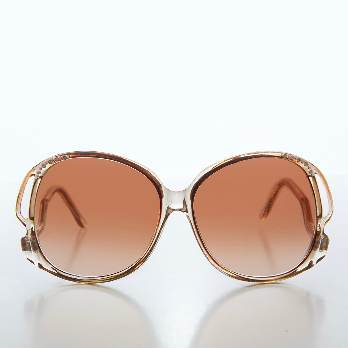 This 80s stand out sunglass features a large round frame with rhinestone accents and stylish upside down temples. New old stock. Never worn. Great condition. UV protection.