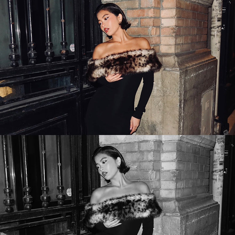 Atmospheric Leopard Print Fur Stitching Off-shoulder Dress