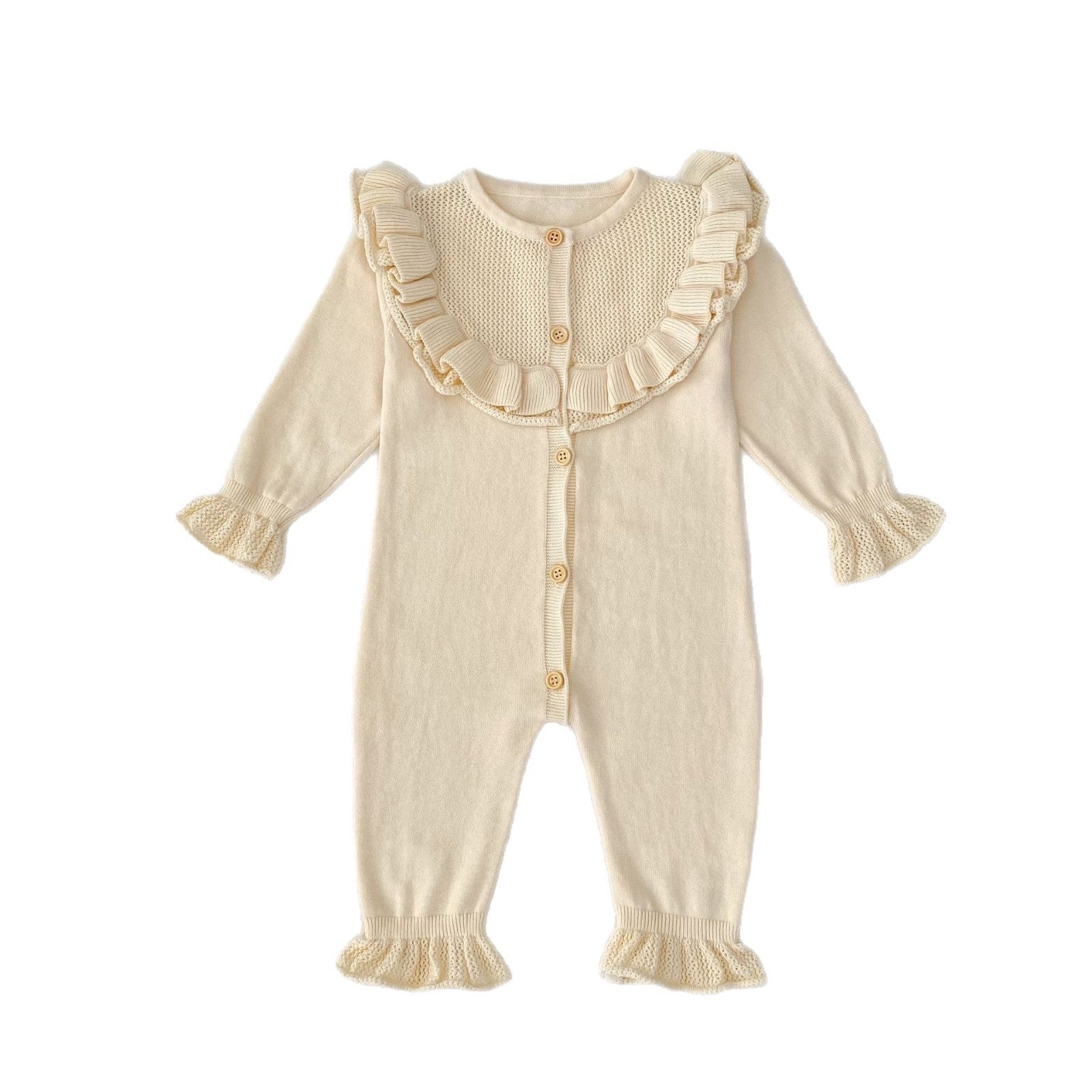 Baby Girl Round Neck Ruffled Stitching Long Climbing Fashionable Stylish Solid Color Jumpsuit