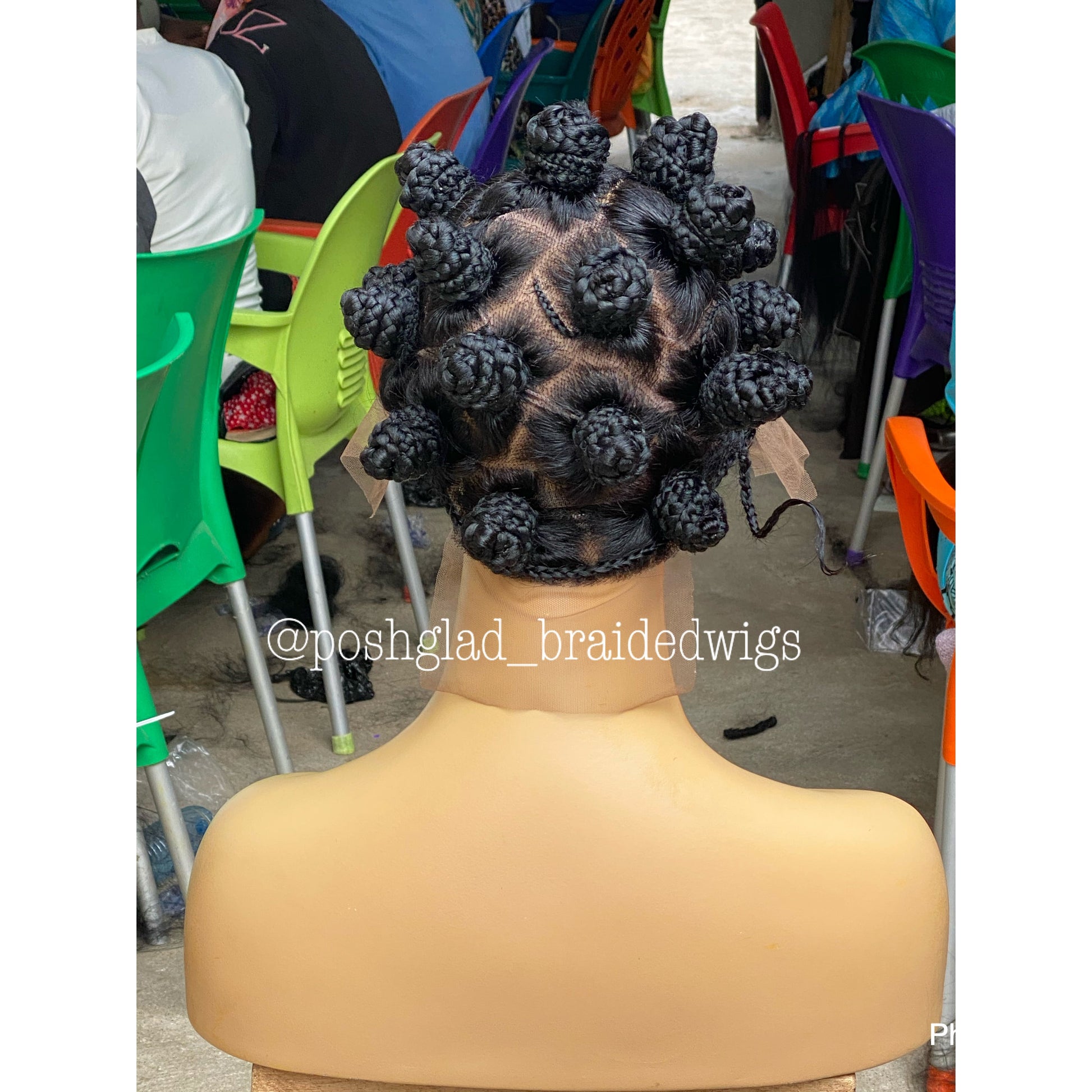 This scalp-looking glueless bantu knots braid wig has 100% human hair up to "8-12" inches, a stretchable medium brown Swiss full lace cap, and a fine blend of quality kanekalon fiber for extra length. It has 3-4 combs inside, an adjustable rubber band, baby hair, and a snap hook for secured installation. The hair root is natural black, the hair color is natural black, the length is 5 inches, and the weight is approximately 48 grams. It can last for up to 2-3 years if properly maintained. Studies show that braiding your natural hair or using harsh shampoo for an extended period causes long-term alopecia, baldness, and unbearable pain. With a poshglad braided wig, you don't have to worry about any of that. Just put your wig on and go—nobody will know it's a wig.