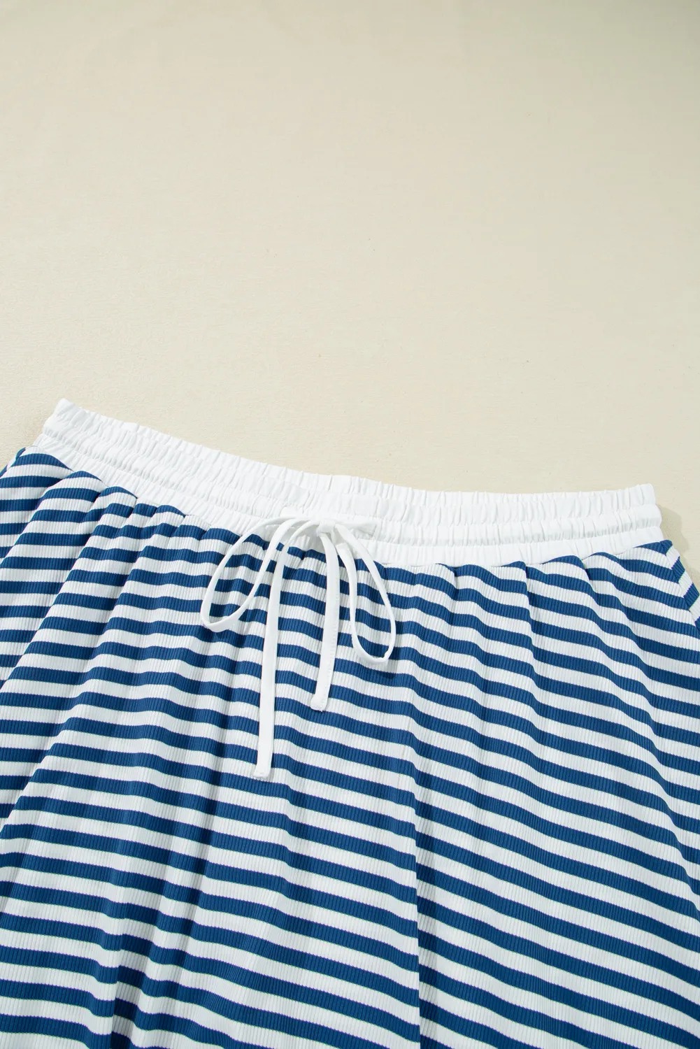 Blue Stripe Short Sleeve Collared V Neck Top Plus Size Short Set