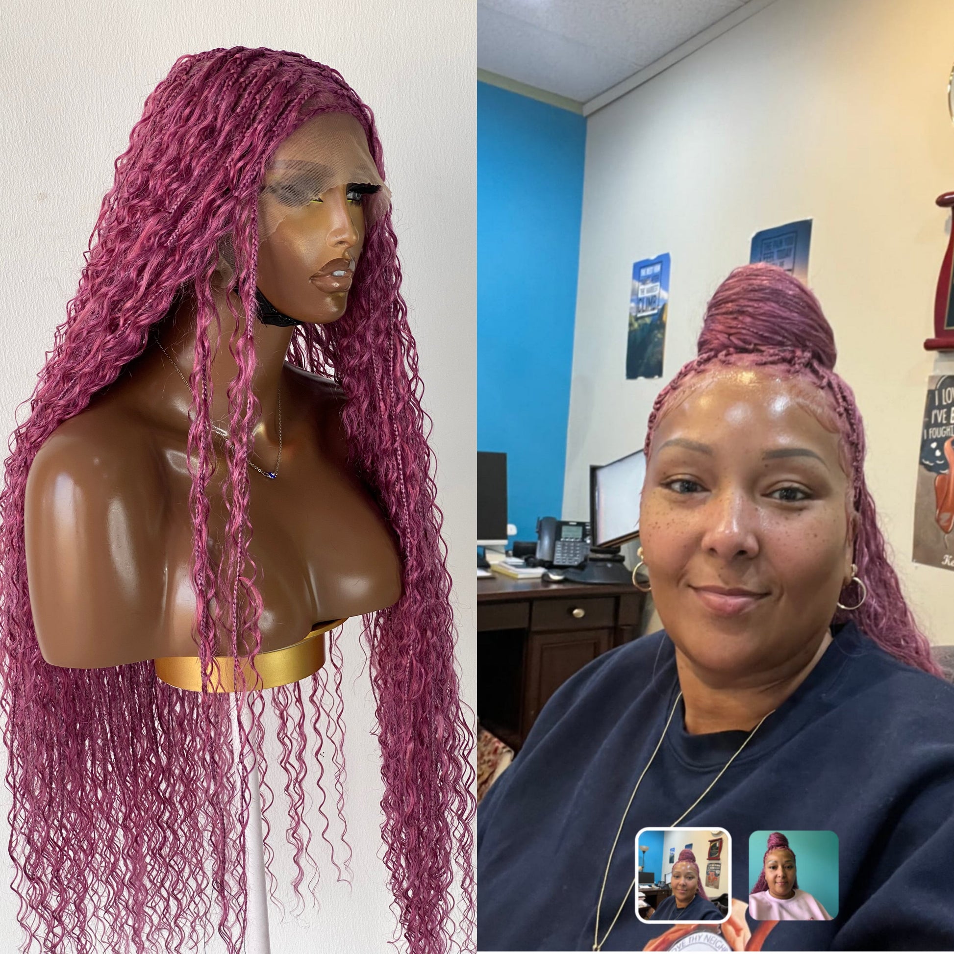Bohemian Knotless Braid Wig, Pink Color (100% Human Hair Curls) Full lace - Tara
