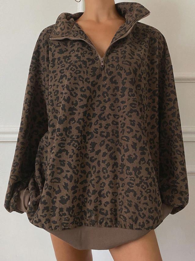 Casual Leopard Print Pattern Corduroy Zipper Sweater