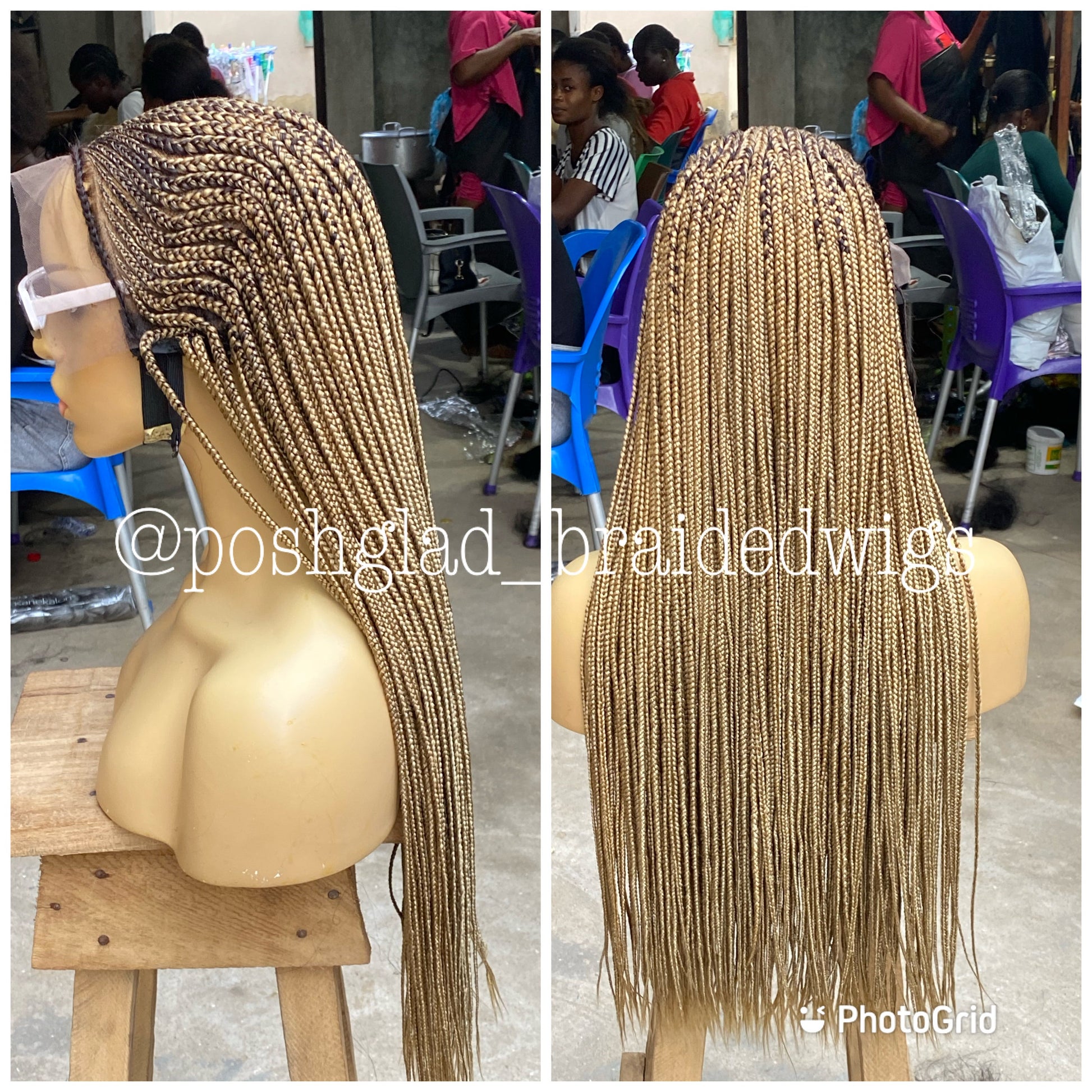 This natural scalp looking custom handmade glueless bob braided wig name - Bolade is made with 100% human hair, 13x6 lace frontal & the best kanekalon premium fiber for extra length. This unit has a 13x6 lace frontal in front and a black cooling cap inside and all the way to the back of the wig. Other accessories are elastic band and an adjustable strap-on to hold it perfectly in place. We offer premium quality wig that look like a scalp, free shipping and 24/7 customer support. No more sitting down in a salon for 8 hours, like gurrrl no! - get your poshglad braided wig, wear it and go. Study shows that braiding on your natural hair causes long term alopecia, receding hairline, baldness and long term hair cancer. With our wigs you don't have to worry about losing your natural hair.