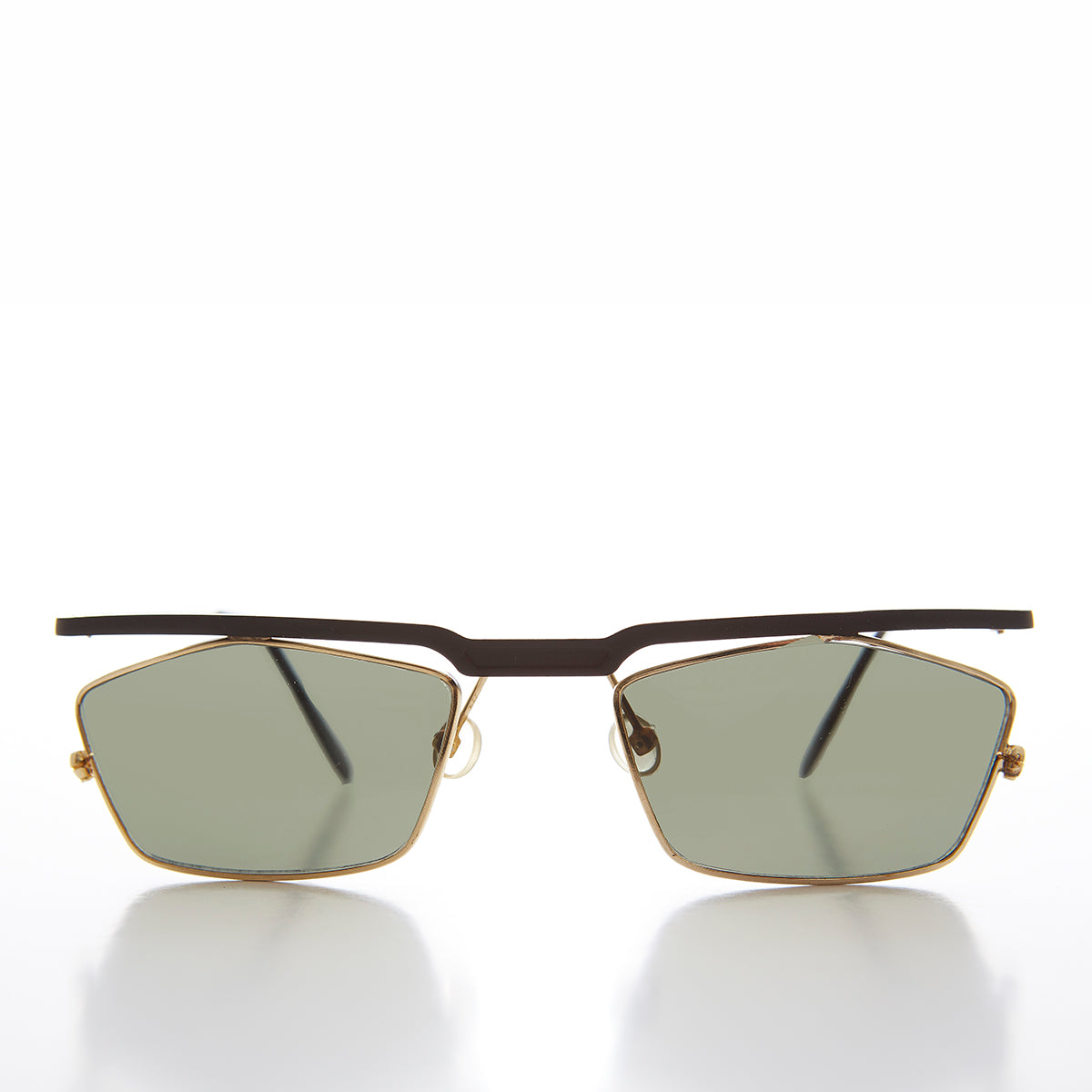 This rare sunglass features a unique shaped floating lens and two-toned color frame. RX optical quality prescription friendly frame. New old stock. Never worn. Great condition. UV Protection.
