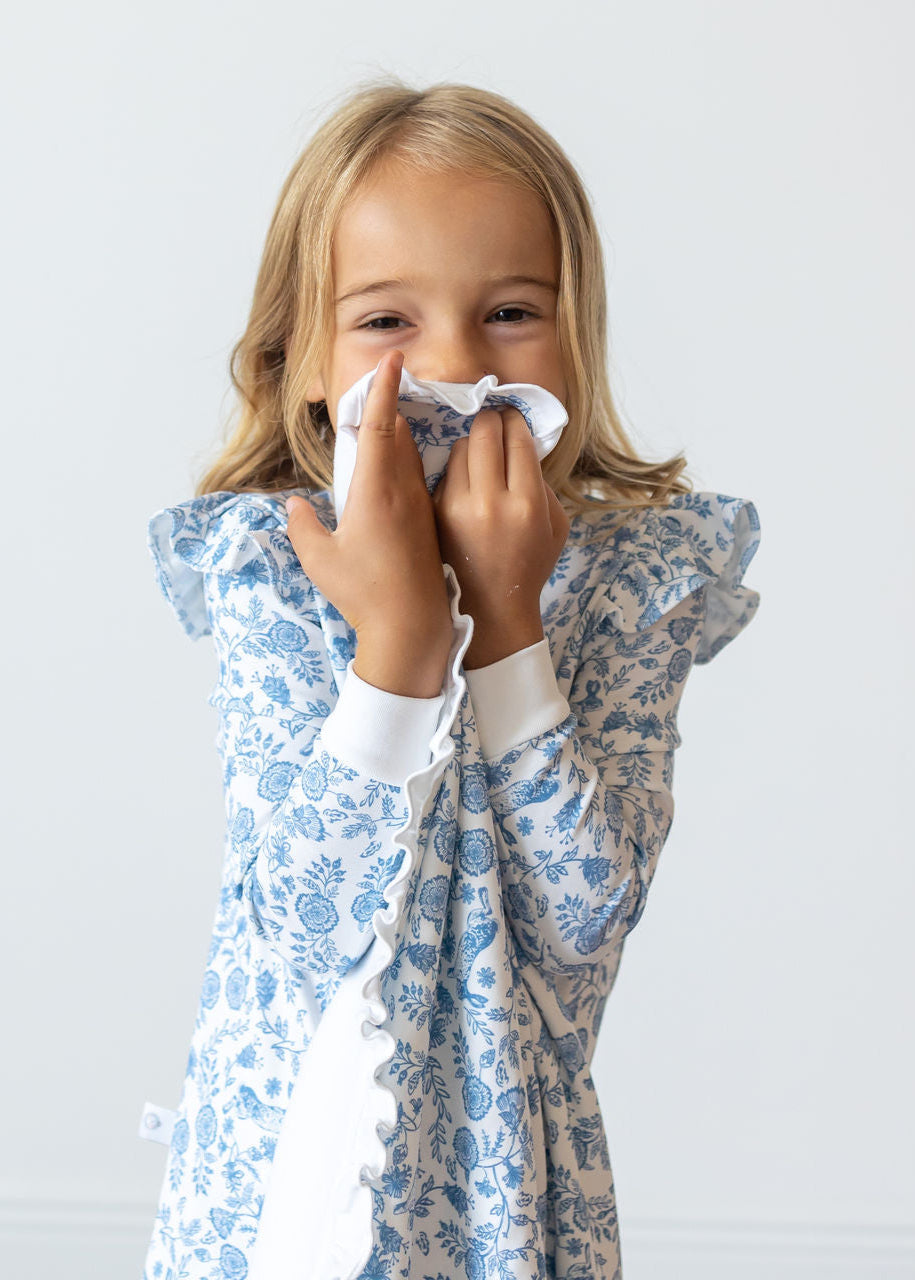 These charming pajamas feature a whimsical print of blue flowers and bunnies, making them a sweet and stylish choice for your little one's bedtime. Made from ultra-soft 100% Pima Cotton, this long-sleeve and long-pant set is perfect for year-round comfort—especially for kids who love to stay cozy and covered all night long.