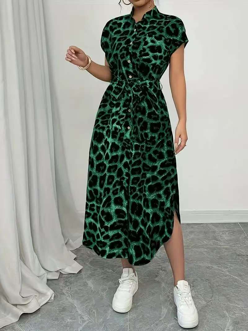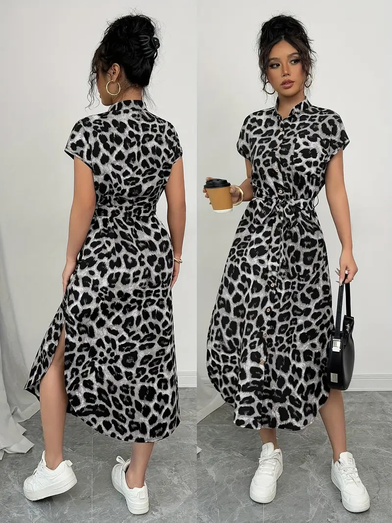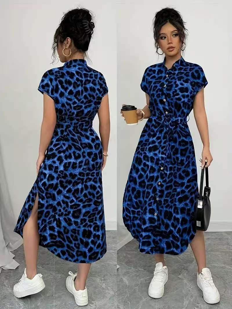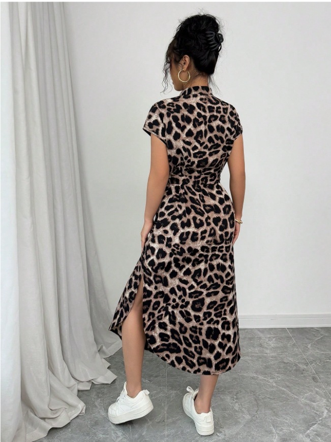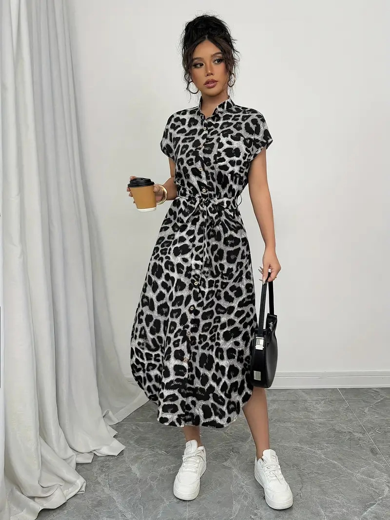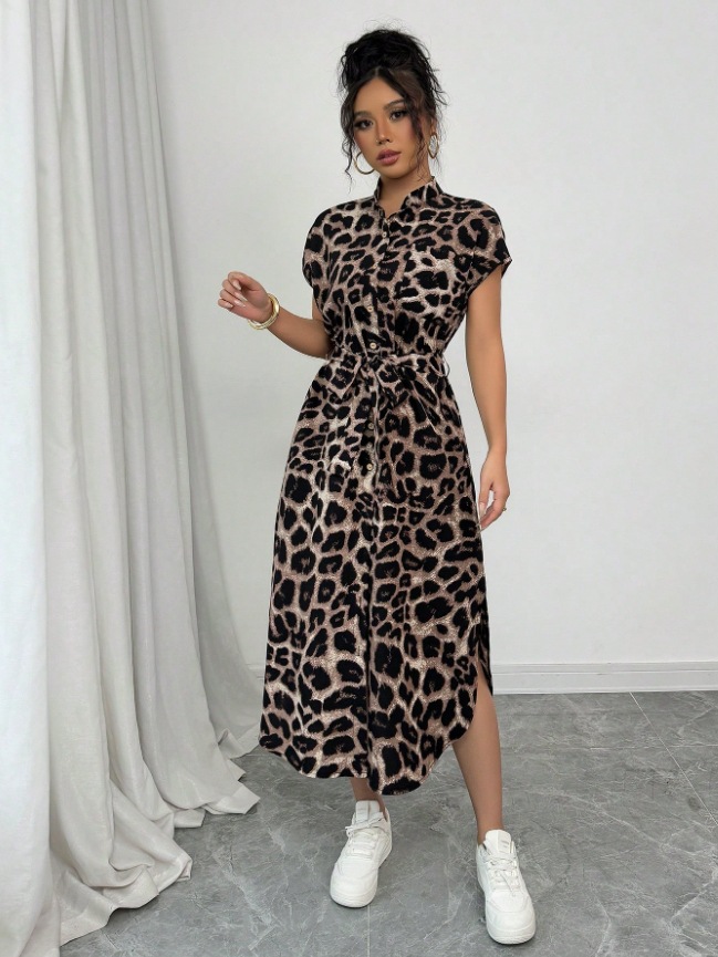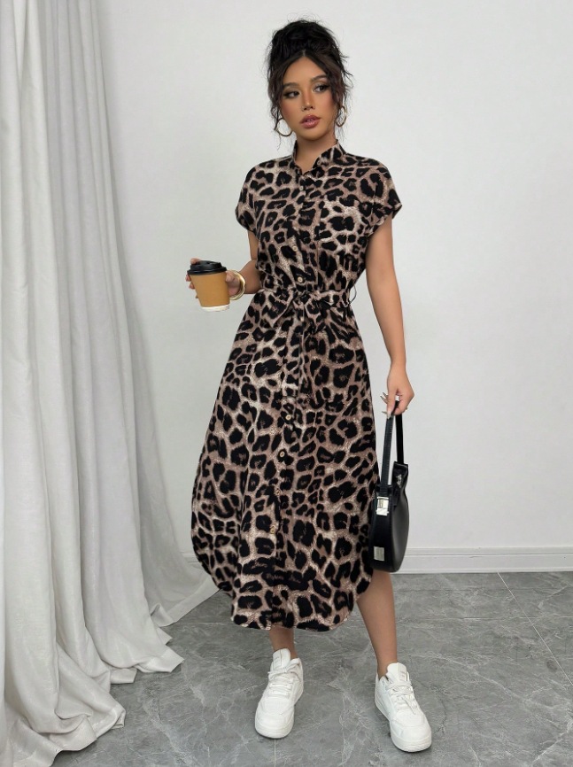 Leopard Print Front Button Shirt Belt Bow Shirt For Women