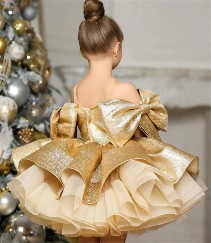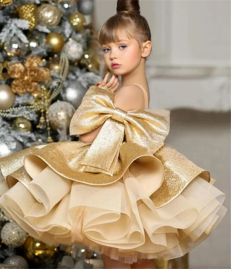 New Gold Satin One Year Old Celebration Dress Western Style Baby Girl Princess Dress