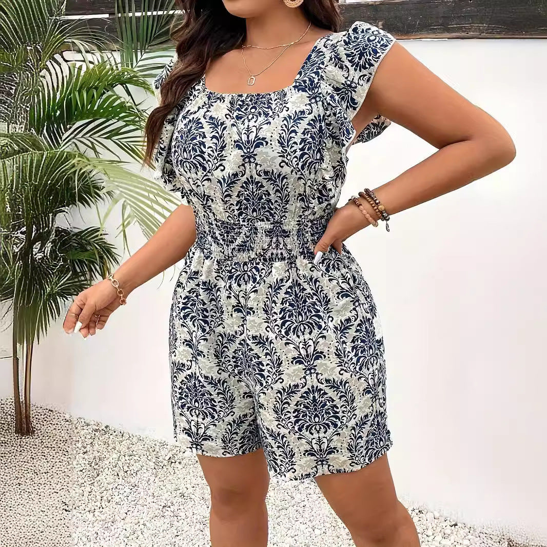 Plus Size Printed Sleeveless Smocking Fitted Waist Backless Vacation Style Jumpsuit