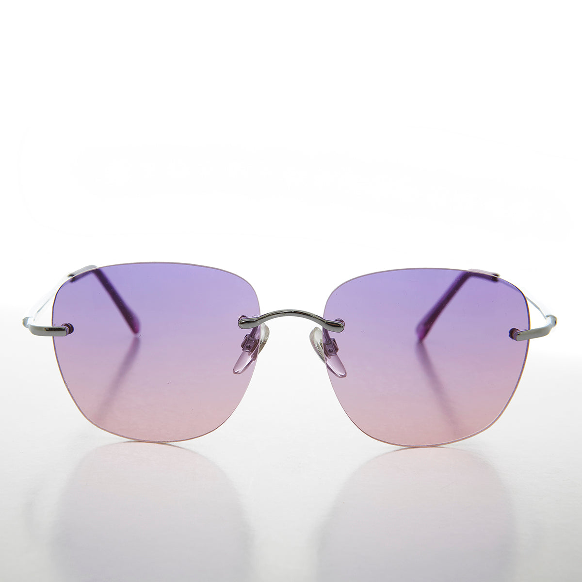 Stunning, oversized, silver, rimless sunglass that features color tinted two-tone lenses with matching temple ends. Get your groove back wearing these outstanding sunglasses. Light weight quality metal frame with metal hinges.