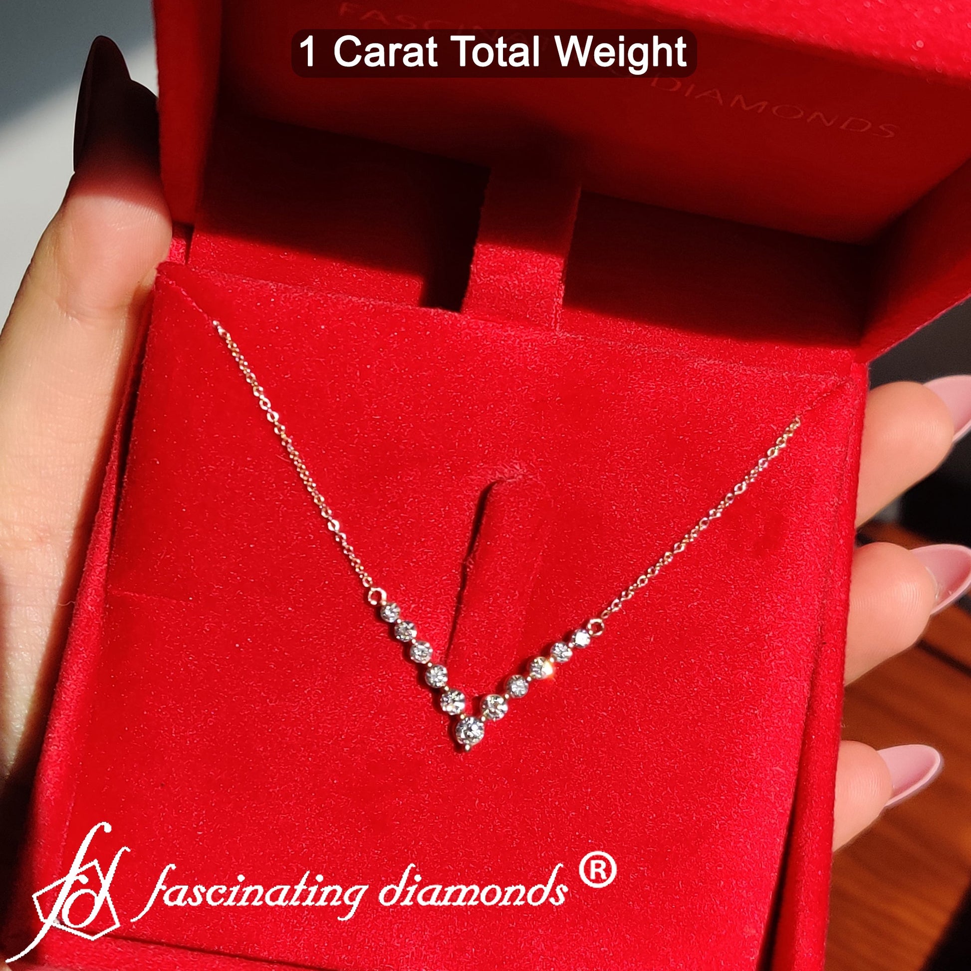 Accent Stones: The accent stones of 0.25 Ct, 0.75 Ct and 1.00 Ct. arranged securely in a prong setting in the Round Graduated V-Necklace. The pendant includes eleven accent stones.