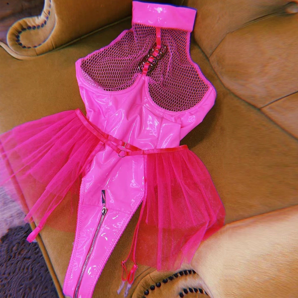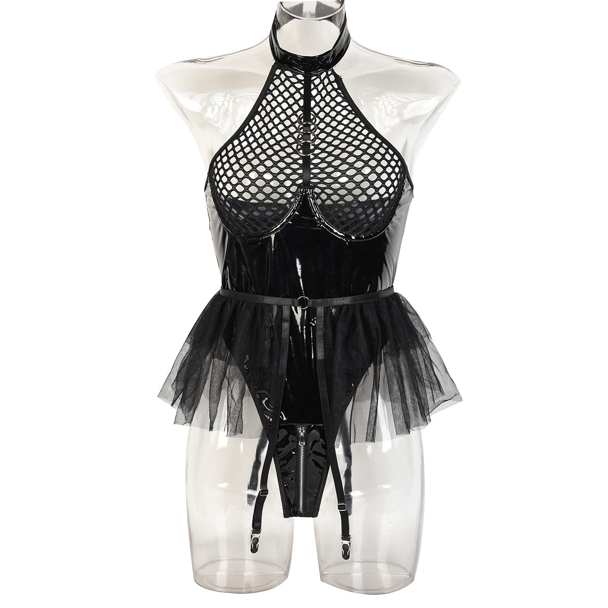 Sexy Faux Leather Patent Leather Mesh Joint Halter Underwear Mesh Tutu Skirt Swing Garter Jumpsuit Detachable