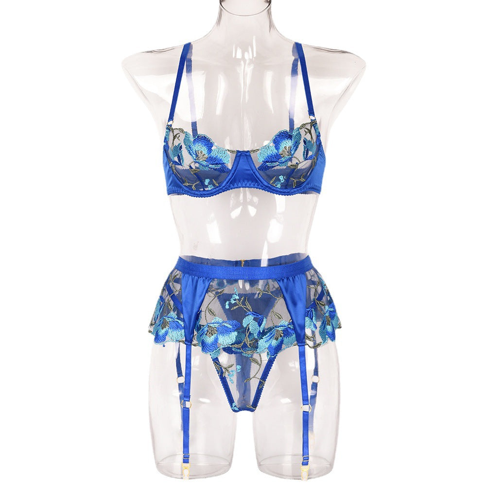 Sexy Lingerie Set Floral Embroidery Three-Piece Set with Steel Ring Holy Blue Goddess