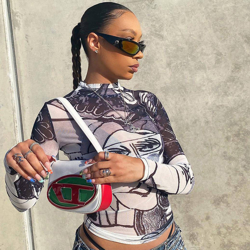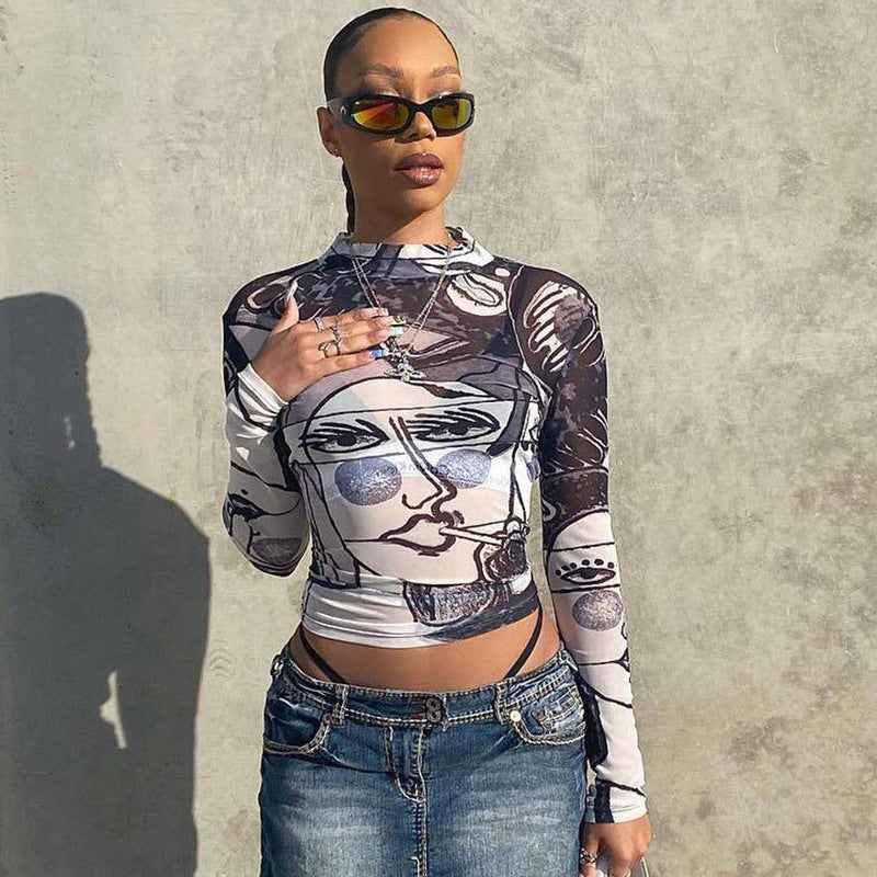 Sheer Mesh Round Neck Long Sleeve Slim-fit Top