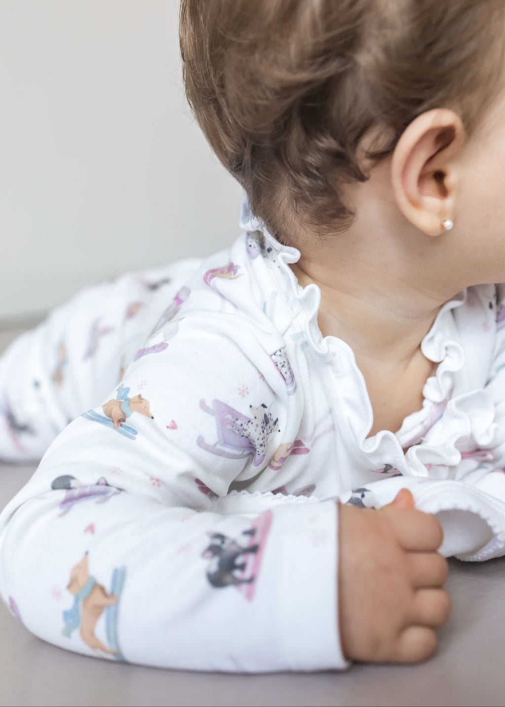 These adorable baby sleep and play feature a lively print of playful puppies hitting the slopes—bringing snowy fun and cozy vibes to your little one’s bedtime routine.
