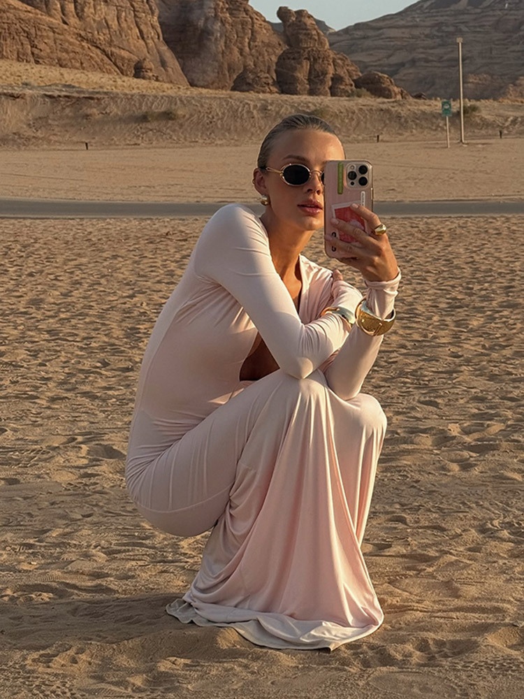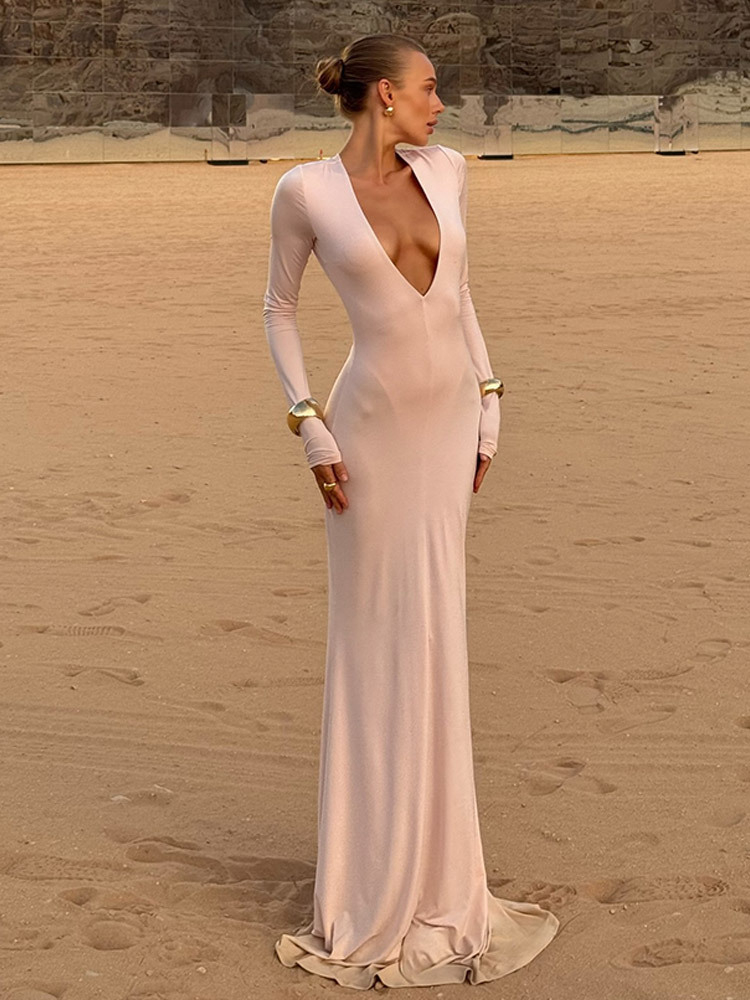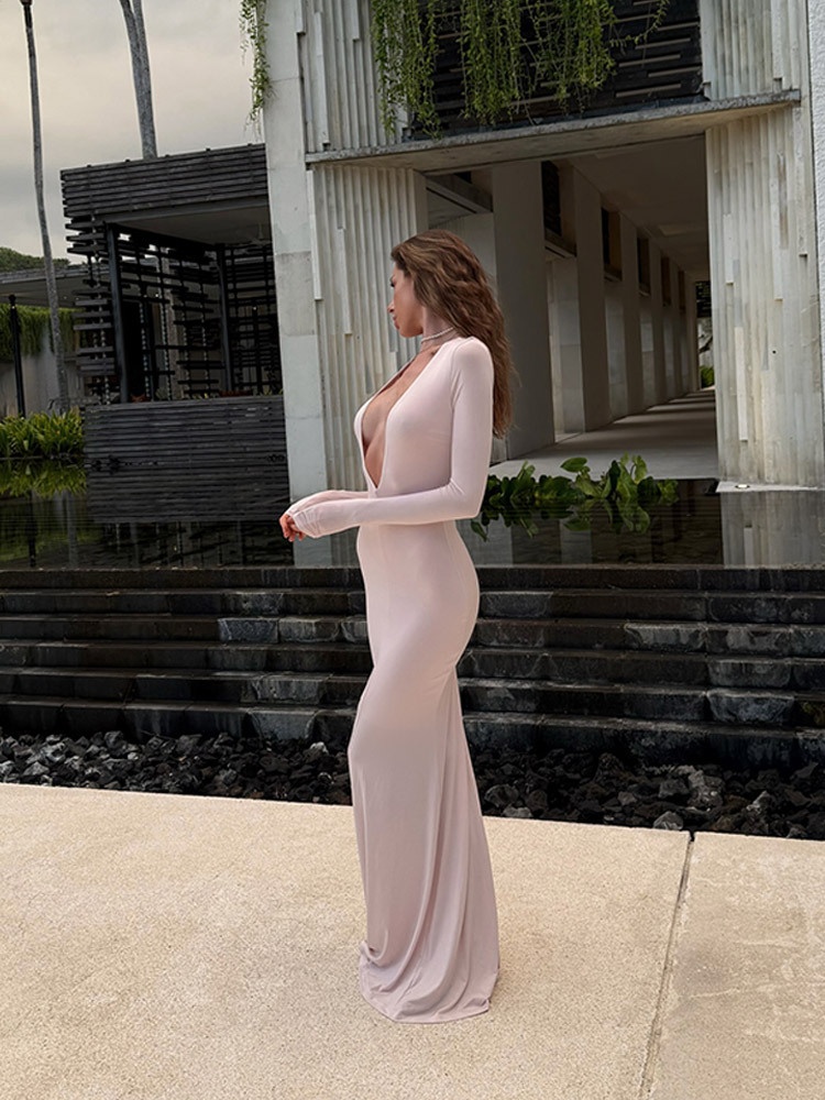 Slim Fit Deep V Long Sleeve Sheath Long Dress