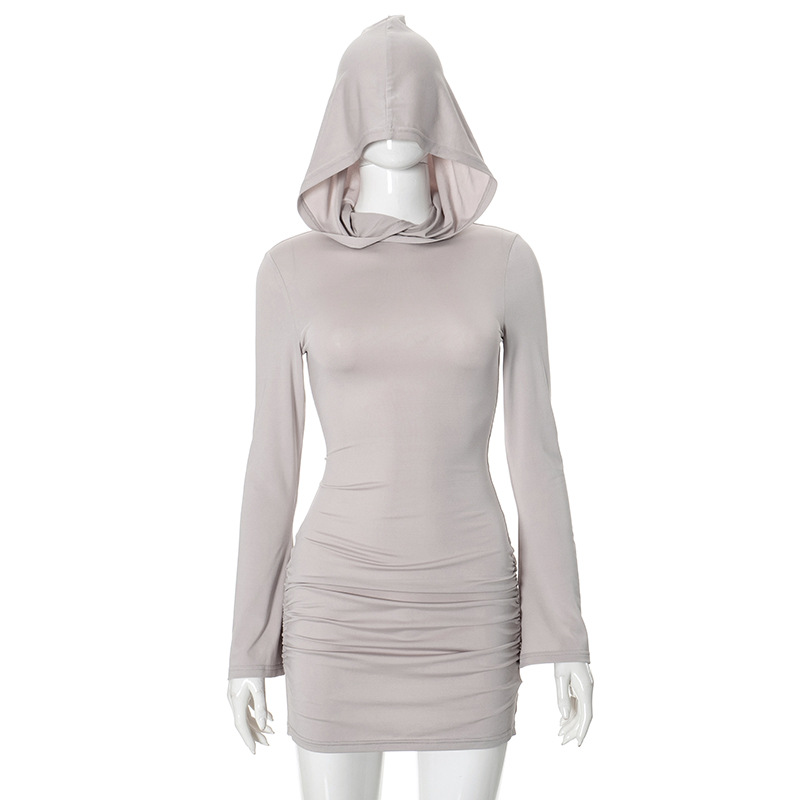Solid Color Long Sleeve Hooded Pleated Sheath High Waist Short Dress