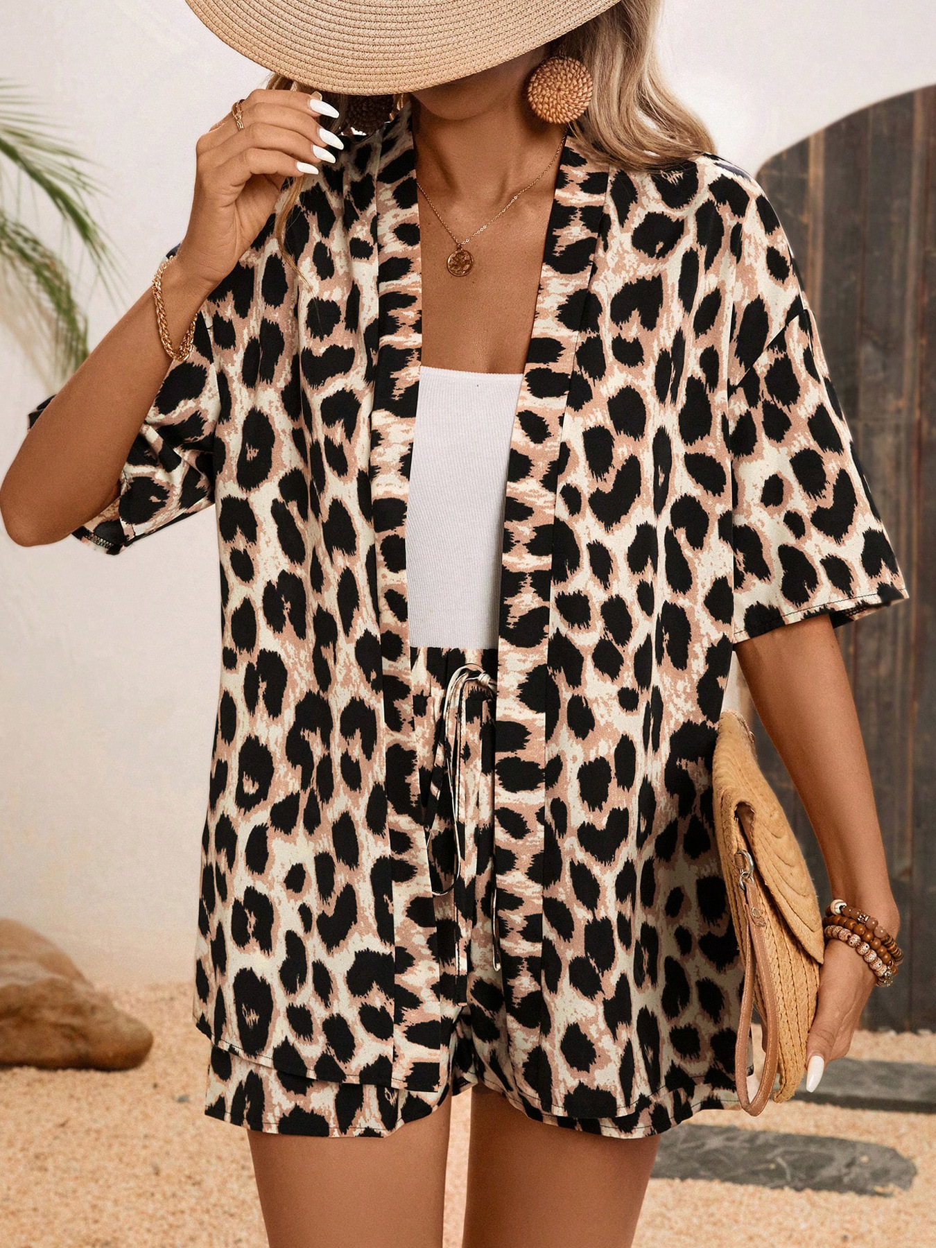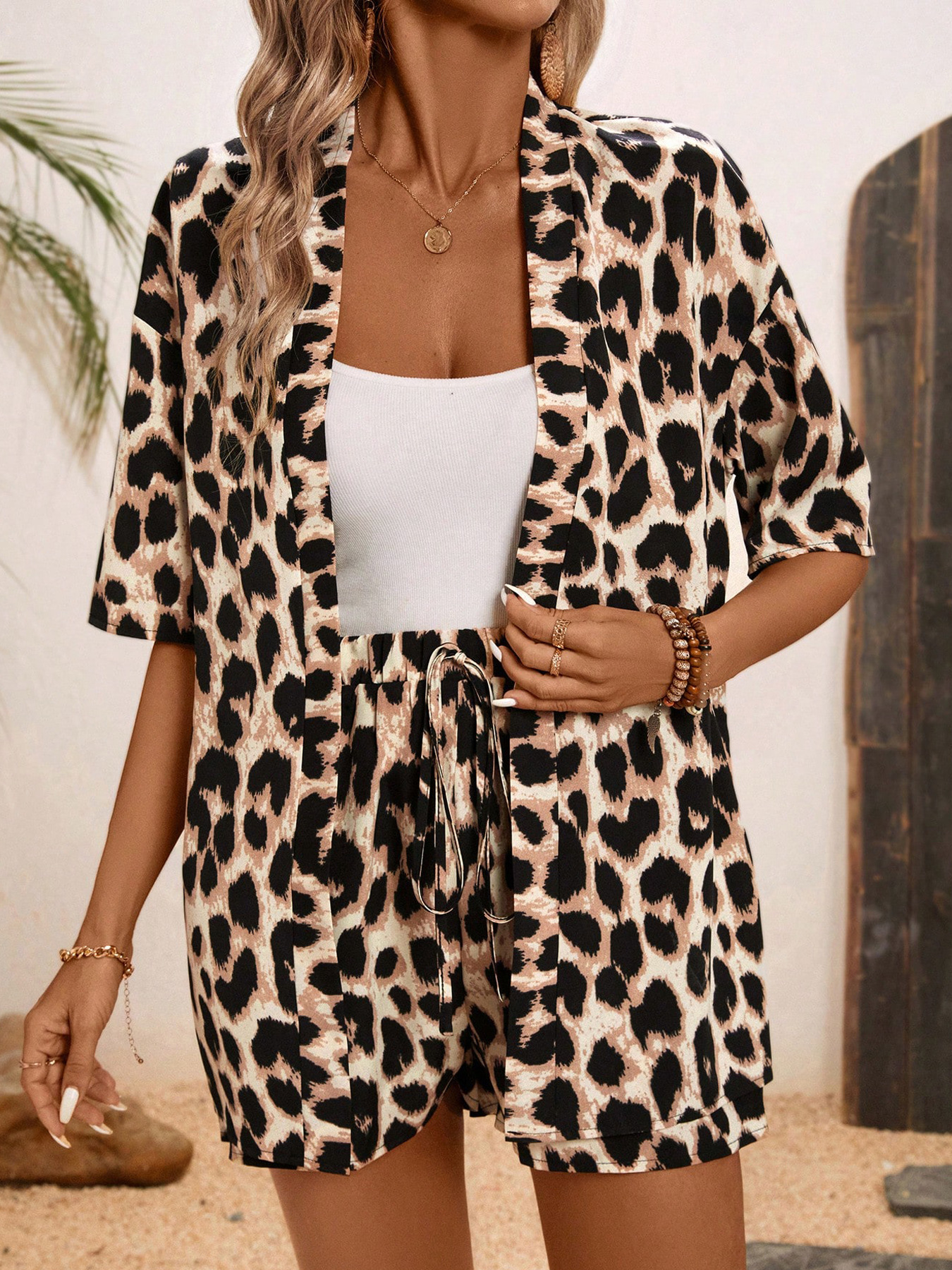 Summer New Leopard Print Cardigan Short Sleeve Top Shorts Two-piece Set