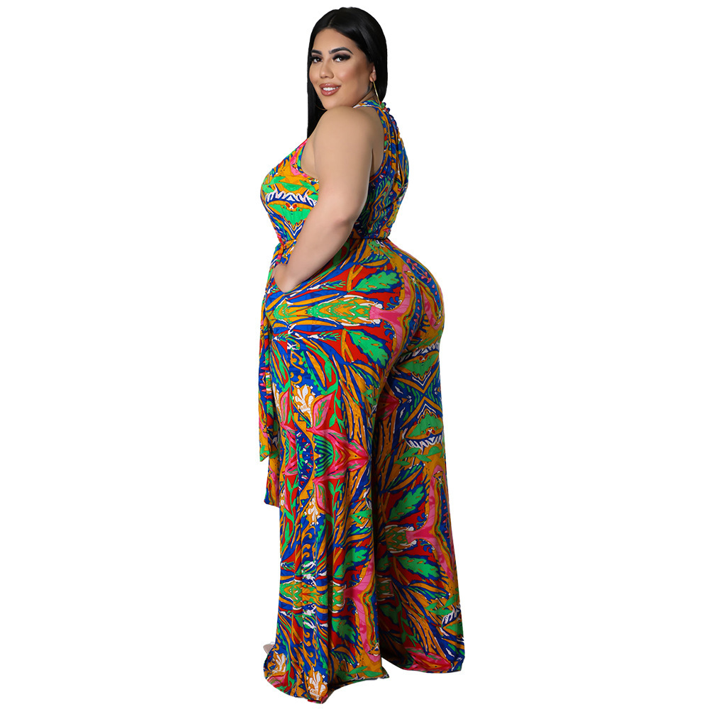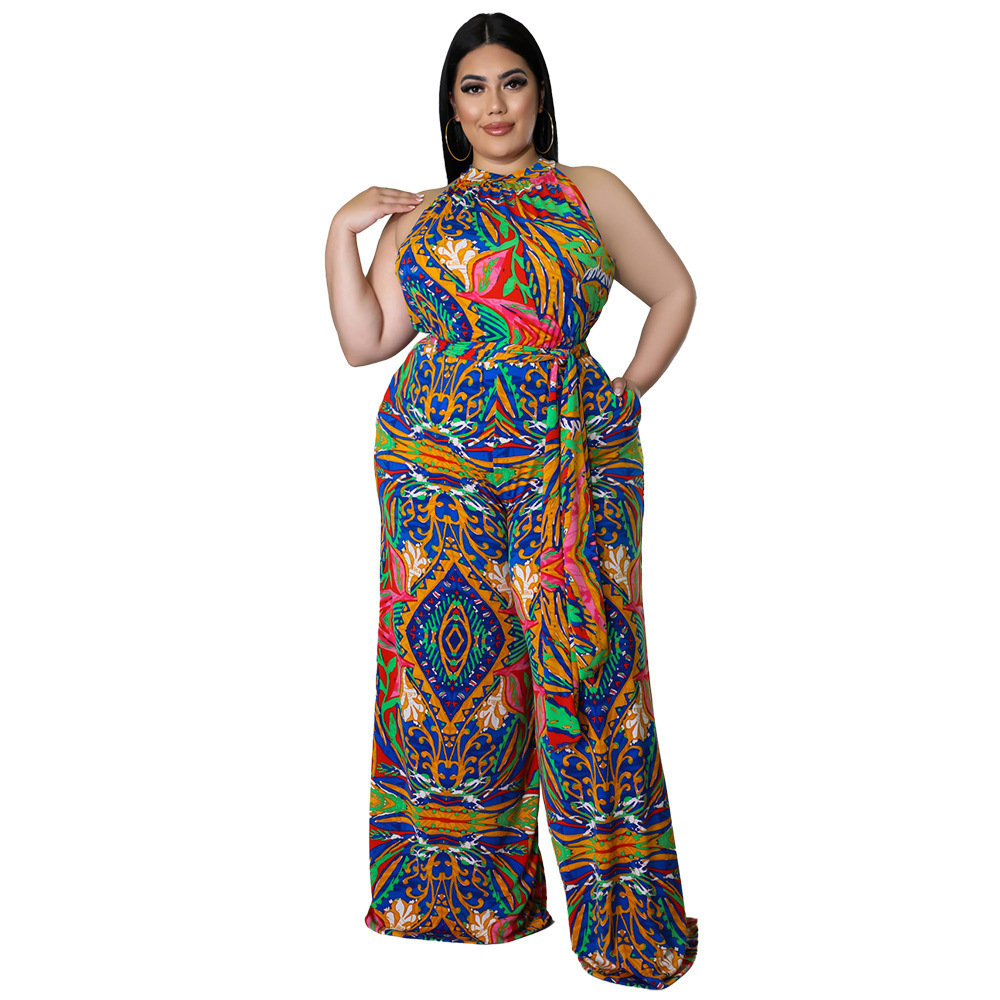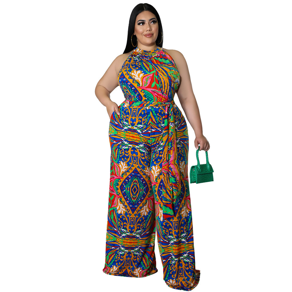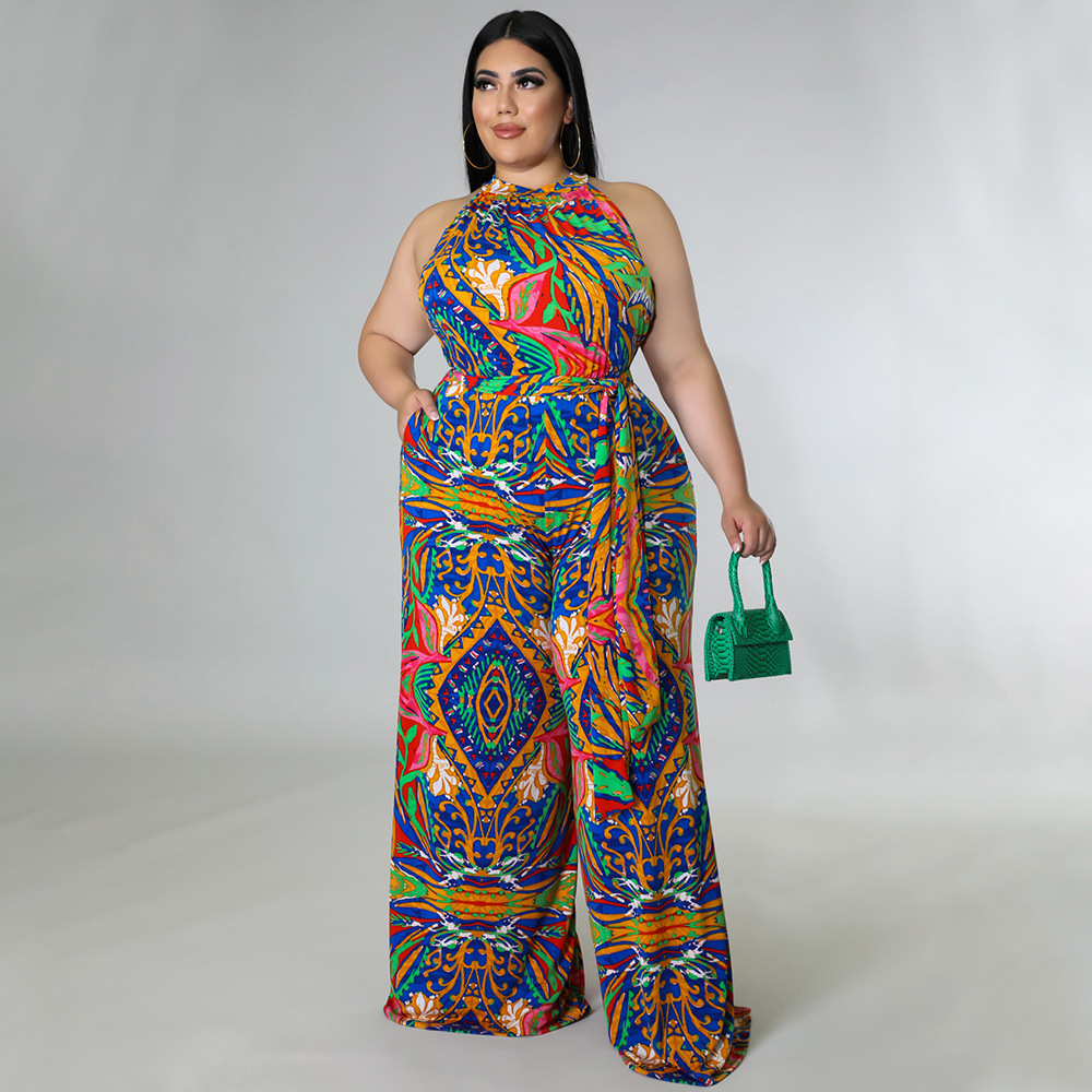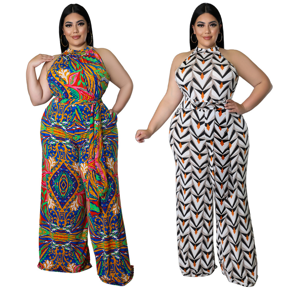 Women's Casual Halter neck Printed Jumpsuit With Belt Plus Size