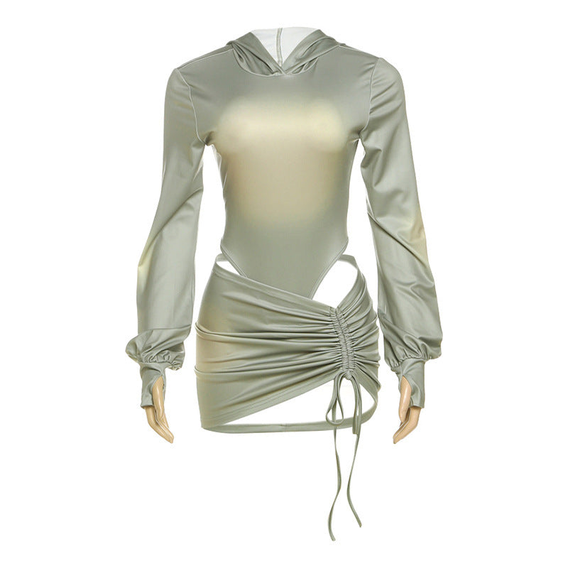 Women's Sexy Backless Hooded Jumpsuit Drawstring Bag Hip Skirt
