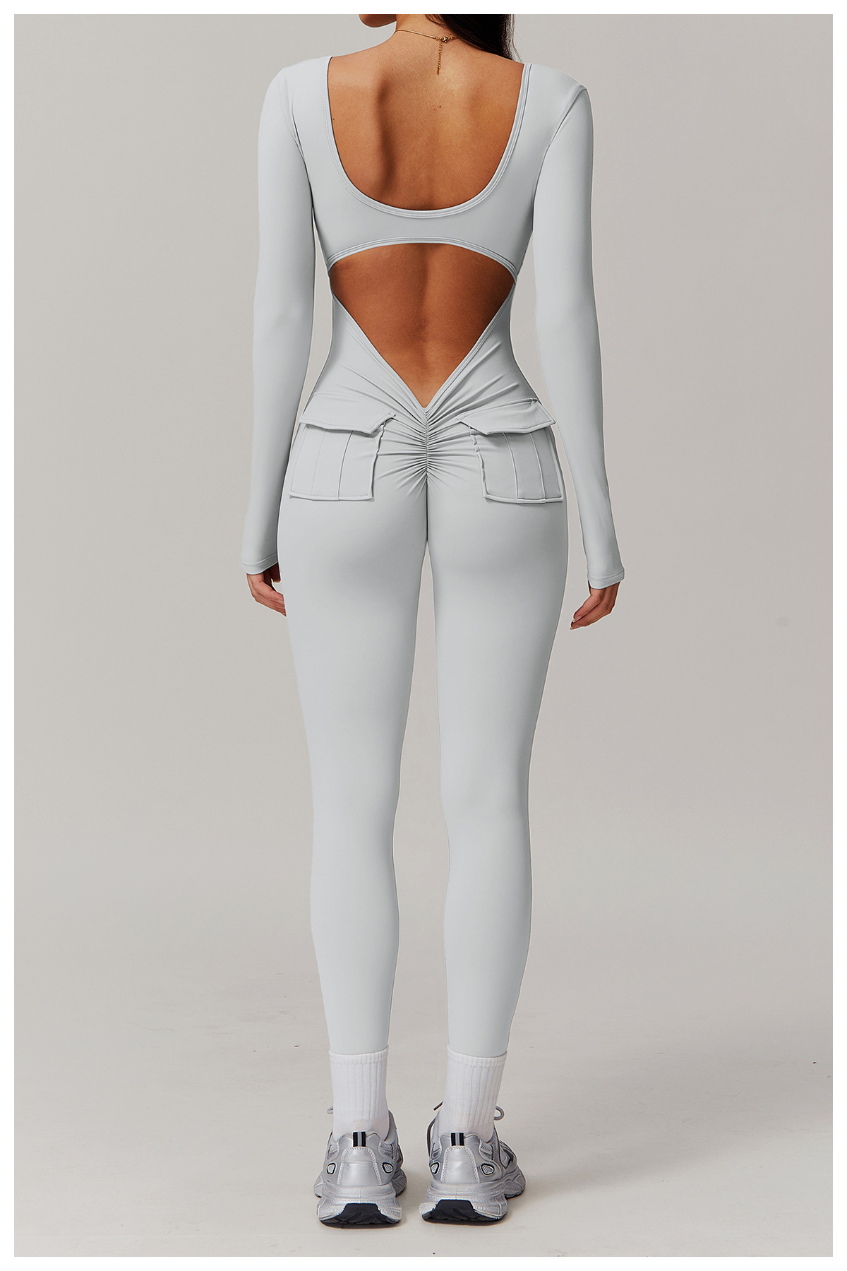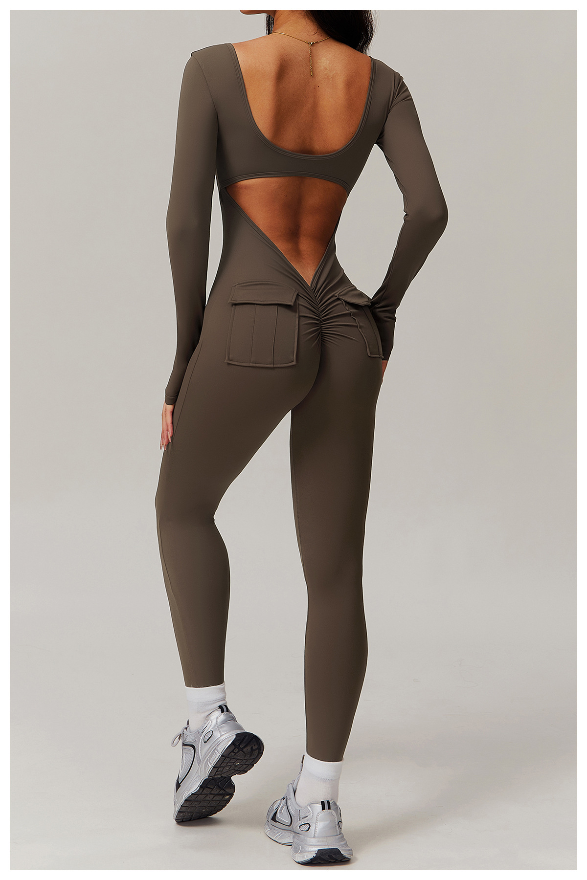 Long Sleeve Yoga Jumpsuit Back Pockets Scrunch bottom Backless
